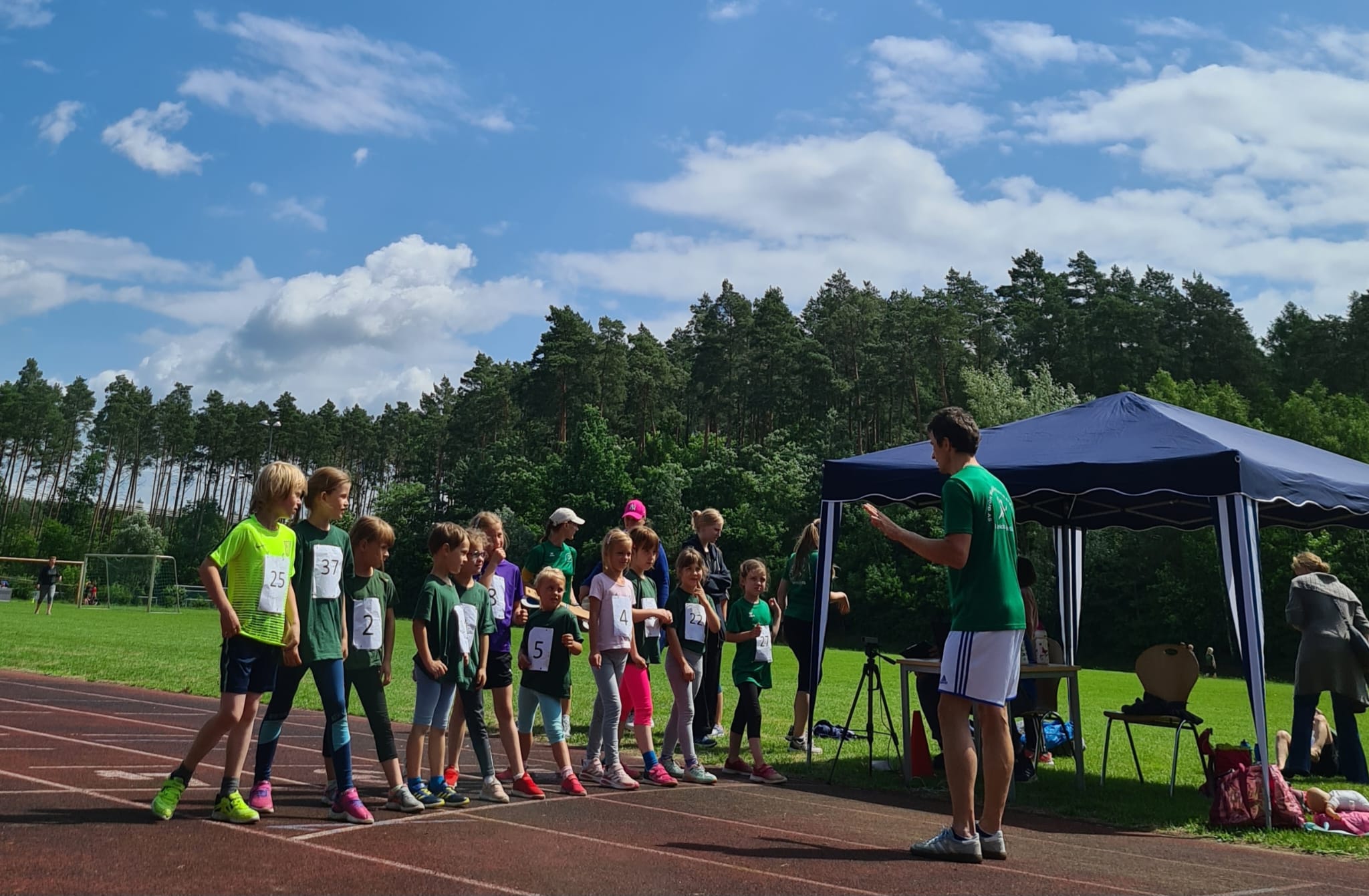 Um 09:30 Uhr begrüßte der Organisator Jens alle Sportlerinnen und Sportler sowie die Angehörigen. Nach einer kurzen Ansprache durch den Abteilungsleiter Leichtathletik Björn konnte die Erwärmung mit Janine und musikalischer Unterstützung durch DJ Sven beginnen und die Kinder machten sich bereit für die einzelnen Stationen, die jeweils durch Trainerinnen und Trainer sowie freiwillige Eltern besetzt waren. Insgesamt wurden die 50 Sportlerinnen und Sportler in 5 Gruppen aufgeteilt und gingen von Station zu Station. Saskia bekam nach jeder einzelnen Abnahme den entsprechenden Laufzettel und konnte diesen bereits in die Auswertungssoftware eingeben. Bei der Sprintabnahme konnten wir unsere neue Zeitmessanlage austesten.